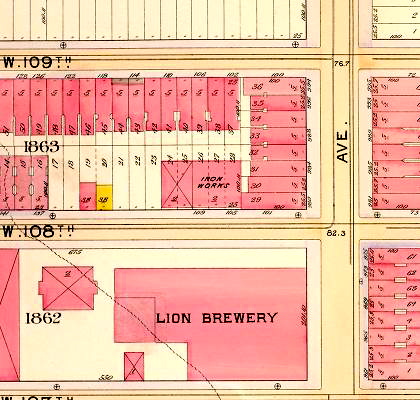 Built just after the Civil War, by 1879 the space included the Lion Park — a Beer Garden — on part of the 107-108 block east of Ninth Avenue. The brewery operations sprawled between Ninth and Tenth Avenues, including the brewery, the malt house where the barley was converted to malt, ice houses, stables, workshops and private residences.