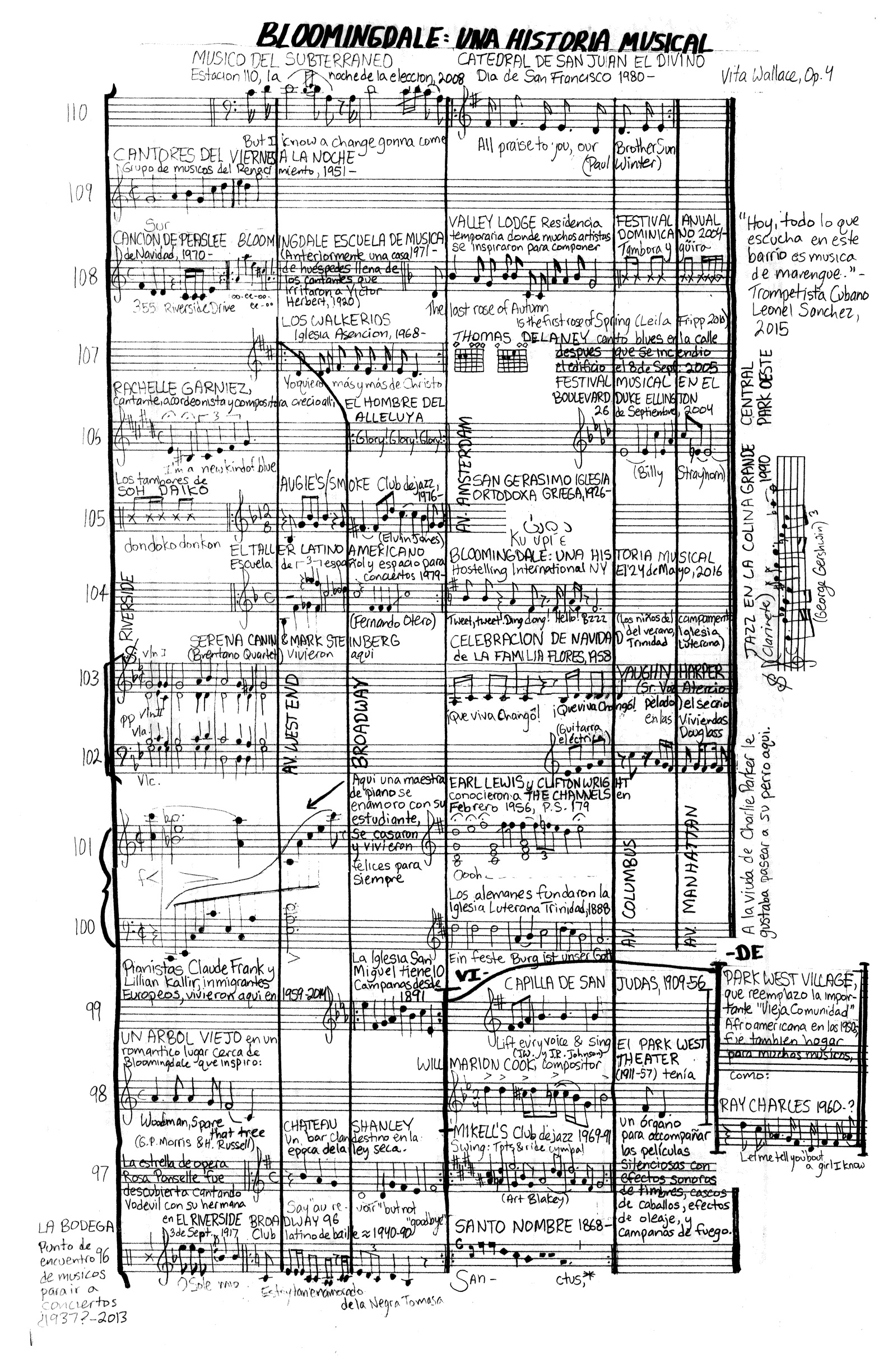 This musical map uses scraps of melody to suggest musical events, musical venues, the homes and habits of musicians, neighbors’ musical memories, and a few elements of the neighborhood soundscape. It would have been impossible to be complete, so I strove instead to give a sense of the variety of musical styles and musical experiences that have occupied, moved, and delighted residents over the last 200 years. How lucky we are to have been a neighborhood of immigrants from many places for so many years! What a marvelous musical legacy we have to share, celebrate, and be inspired by! The cross-streets are represented by musicals staves, the avenues by bar-lines. How to use this map, I leave to your imagination.