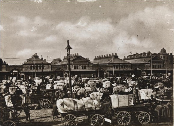 Food history is a popular topic among historians now. A recently-published book, Feeding Gotham: The Political Economy and Geography of Food in New York 1790-1860, by Gergeley Baics gives a fascinating history on how “food provisioning” developed in New York City. This book details the changes in the city’s food distribution as it changed from restricted public marketplaces built by city government to privatized food distribution as a function of the marketplace. These food markets were once part of the city’s landscape: Fly Market (replaced by Fulton), Catharine Street, Essex, Jefferson in Greenwich Village, and the Washington Market, on the lower west side. By the 1870s, the Gansevoort Farmer’s Market, near the Washington Market, was established: a vast stretch of wagons, as pictured below. Meat, poultry and dairy purveyors as well became the distribution center for the wholesale merchants who supplied the retail stores. This section of the city eventually gave way to Hunt’s Point in the 1960s, and what we now call Tribeca emerged as a new residential neighborhood.