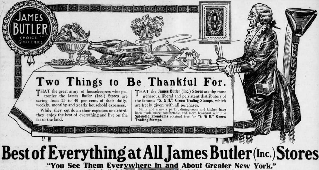 Mr. Butler owned an estate in Tarrytown, New York, and was neighborly with the Rockefellers. He was also a prominent owner of racehorses, and built the Empire City Racetrack in Yonkers. He made home deliveries from his stores, and when his delivery horses became old, they left the streets to retire to his estate. He established Marymount College in memory of his wife. He made many gifts to the Catholic Church over the years, so many that the Pope awarded him a Knight Commander of the Order of Saint Gregory. Throughout his life, even as his fortune grew, he called himself “the Egg and Butter Man.” His son James Butler Jr. was more interested in horse racing than grocery stores, and as the Depression played out in the 1930s, the company sought “reorganization” and then bankruptcy. One lone store was still operating in 1940 in Queens. In October 1940, Butler Jr. died after being thrown from a horse. Mr. Butler’s store pictured here was in Astoria, Queens, but all of the establishments were branded in green and gold exteriors.