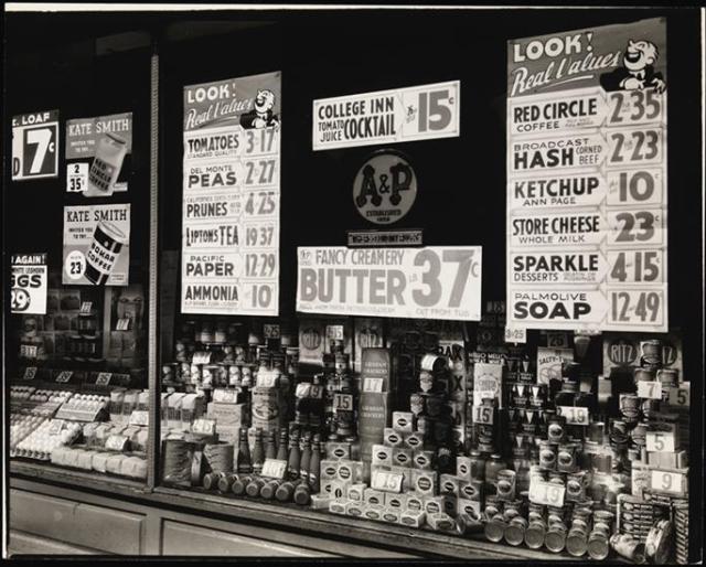 The 1940 telephone directory, online at the New York Public Library, does not have a yellow pages, but numerous Bloomingdale businesses are listed. There is just one Acker Merrall & Condit grocery store, at 2377 Broadway. Gristede’s has seven stores on Amsterdam between 77th and 115th Streets; seven on Columbus, with two at 93rd and 104th Streets, and eleven on Broadway from 75th to 111th Streets, with stores at 99th, 103rd, 108th in our neighborhod. There is a Winkelmann Brothers grocery store at 2388 Broadway, next door to Reyman’s French Pastry Bakers at 2387. The A&P stores are listed by their store number in the directory: there are A&Ps at 724 and 768 Amsterdam, 2507, 2732, 2827 and 2886 Broadway, and 727 and 908 Columbus, with nine stores along Columbus in total. This Berenice Abbott photo from the mid-1930s, while taken on the East side, serves as an example of a grocery store window during this period.