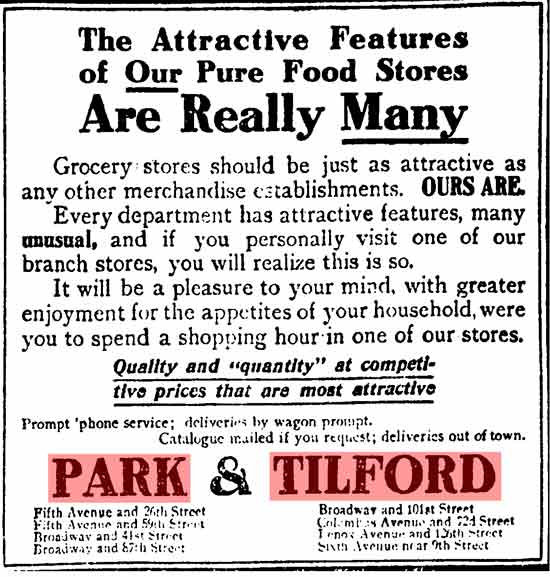 Park & Tilford was one of the earliest “chain store” grocers, but struggled with family changes after their founders died in the 1890s. Mr. Park’s children both married people he did not approve of, and he wrote them out of his will, leaving his million dollar fortune to charities while settling small annual amounts on his son and daughter. The son became an object of derision in the press when he sued the estate to recover more of his father’s fortune, claiming that he had been brought up “in idleness” and had no skills to take care of himself and his wife, an actress. Mr. Tilford’s sons seem to have been raised to be part of the family business, and it passed into their hands. In 1928, the Schulte Retail Stores Corporation, a chain of more than 40 cigar stores, merged with Park & Tilford. Tom Miller, in his excellent blog post DAytonian in Manhattan, wrote about the Columbus Avenue store