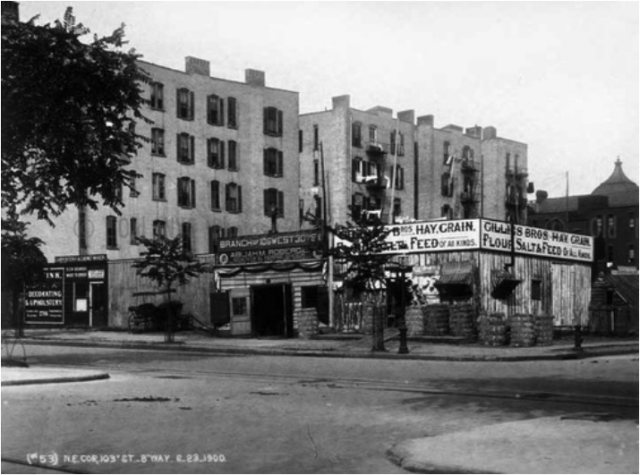 Caitlin Hawke in her research of Bloomingdale neighborhood stores found this photo of Broadway’s northeast corner at 103rd Street, showing a shop selling feed and grain, demonstrating the country-like atmosphere of the turn-of-the-century Bloomingdale. The odd-shaped building on the horizon is the Home for the Destitute Blind constructed in 1886 but removed about thirty years later.