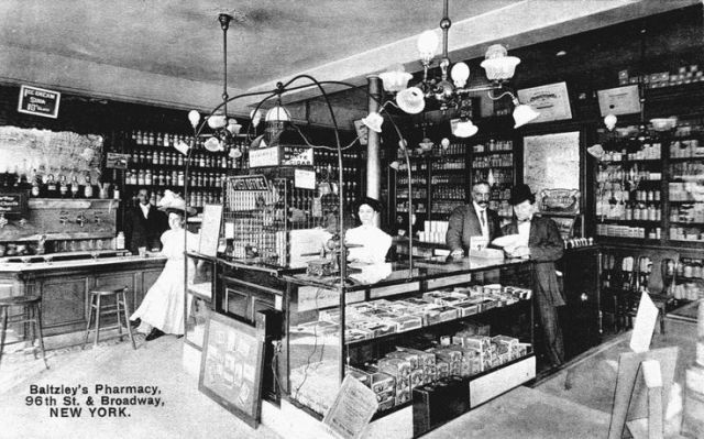 Pharmacies—and later drugstores—were numerous in the Bloomingdale neighborhood. One of the earliest photos of a pharmacy shows Baltzley’s, located at 96th and Broadway in the Wollaston that was built in 1900. The photo shows a large array of products, and this store had a Post Office operating there as well, although it may have just been a drop-off location. Mr. Albert B. Baltzley owned it, his daughter Elizabeth worked there as a cashier, while a Mr. Henry “Hank” Miller was the popular manager.