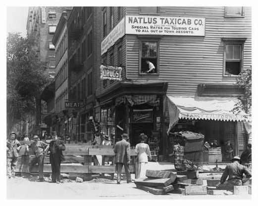 Here’s another photo of a drugstore, this one at 110th and Broadway, taken when there was street work underway, perhaps part of the 1904 subway construction. (There’s a lot more to see here; a meat store, a fruit store, and a taxi company advertising their services to “out of town resorts”.)