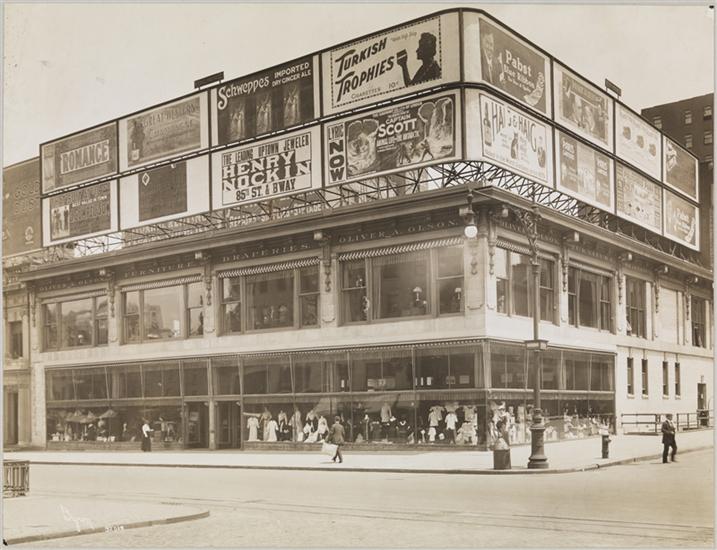 Advertising on top of certain buildings was part of the street scene; this photo (below) from the Museum of the City of New York shows Oliver A. Olson’s store with many billboards. Olson’s had been a “high class” specialty store for women in its time on the Upper West Side. This view is of a 1907 postcard. Olson’s was mentioned in a 1919 article about the formation of a Mutual Protective Association formed with a number of New York City department stores, to protect against shoplifters and pickpockets. This member list included many of the stores that have continued or disappeared over the years: Best & Company, Stern Brothers, Franklin Simon, Bloomingdale Brothers, Gimbel Brothers, Saks & Company, and Lord & Taylor.