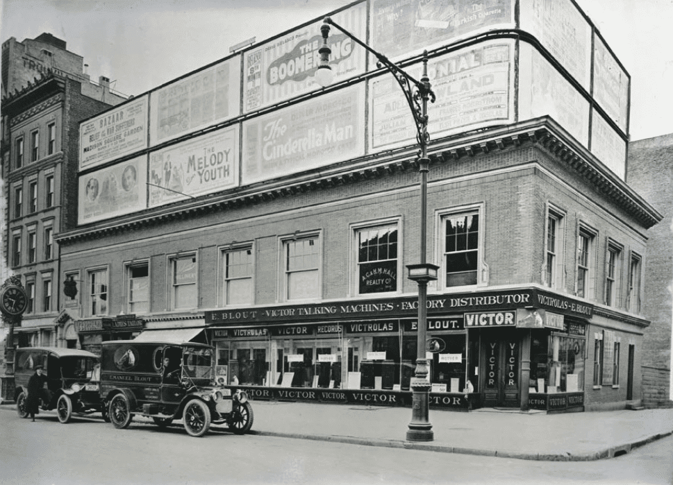 Another Caitlin Hawke discovery: there was a store on Broadway at 108th Street, what we would today call a “destination” store: Emmanual Blout’s Victrola Store. Mr. Blout’s store replaced a group of stores shown in a photo (below) dated 1910, including a restaurant and a funeral parlor. The photo of the Blout store is undated; in both the 1912 and the 1923 Trow New York City Directories, the store is listed at 2799 Broadway. As the sign indicates, this store was distributing the machines and records of the Victor Talking Machines Company manufactured in Camden, New Jersey.