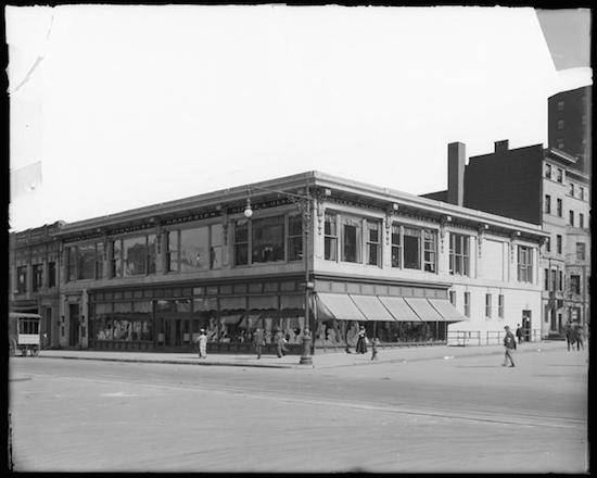 Here’s another photo of a drugstore, this one at 110th and Broadway, taken when there was street work underway, perhaps part of the 1904 subway construction. (There’s a lot more to see here; a meat store, a fruit store, and a taxi company advertising their services to “out of town resorts”.)