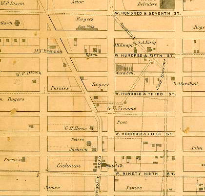 The Croton Aqueduct was developed in 1840-41 just as the Clendening estate was being divided and many house lots sold. Mr. Robert Marshall bought the Clendening home. This 1867 map showing the Aqueduct’s route has Mr. Marshal’s name where the homestead was located. Another place name, Manhattan Valley, referred to the deep valley north of our neighborhood, in Harlem, not today’s Manhattan Valley that runs west of Central Park from 100th to 110th Streets.