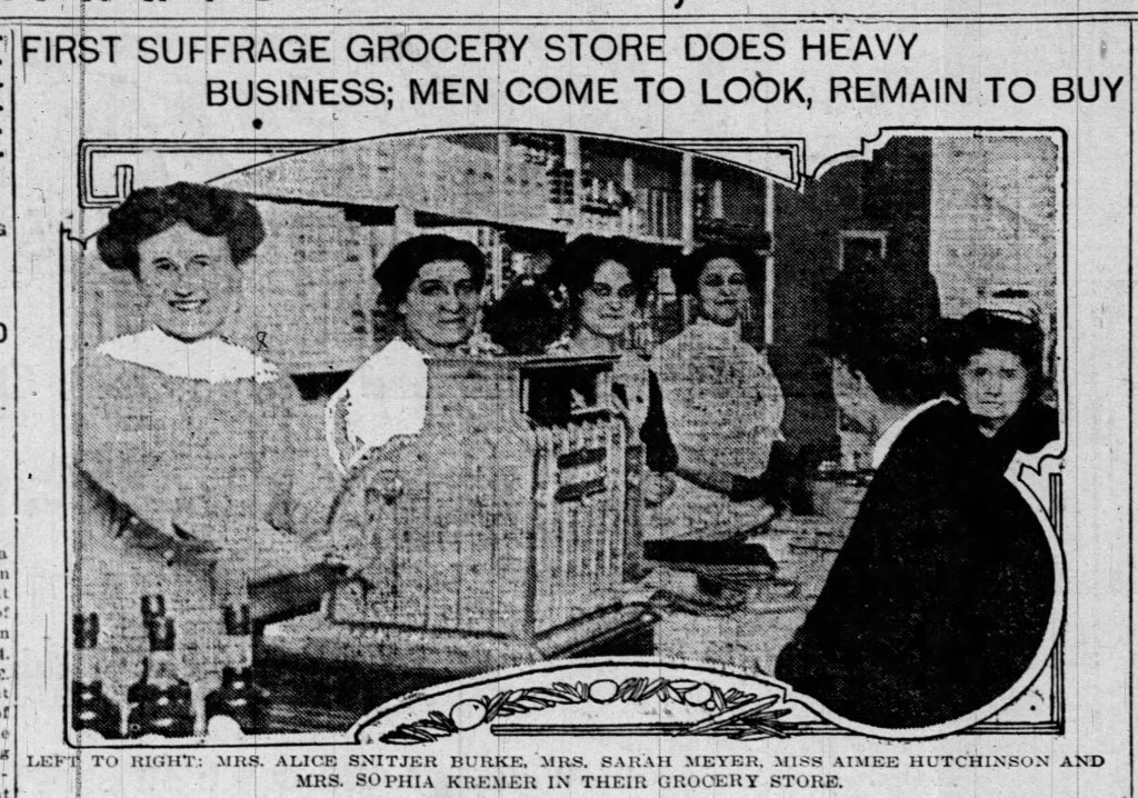 The publication of the Woman Suffrage Party, The Woman Voter, referenced regular Saturday evening meetings at 96th and Broadway, enrolling both men and women who supported the suffrage cause. The grocery store served as “a rostrum” for Wednesday afternoon meetings for high school students when Aimee Hutchinson would speak.