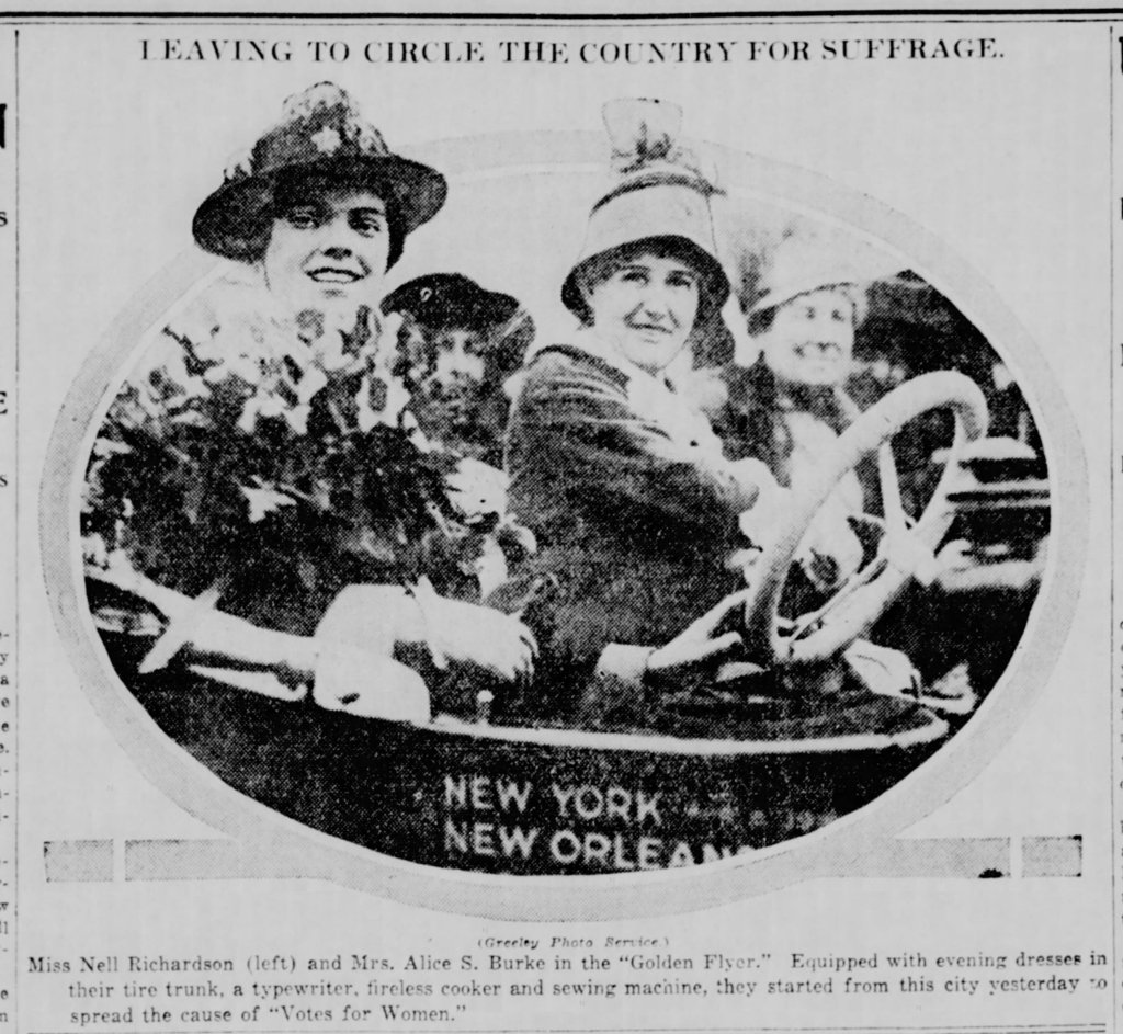 For the U.S. trip, Burke and Richardson drove in a yellow Saxon, nick-named the Golden Flyer, a lightweight car donated by the company which also worked out an itinerary for them that would bring them to a hotel every evening as they had no plans to camp out. Carrie Chapman Catt broke a bottle across the radiator as they left 42nd Street on the ferry to New Jersey and headed south.