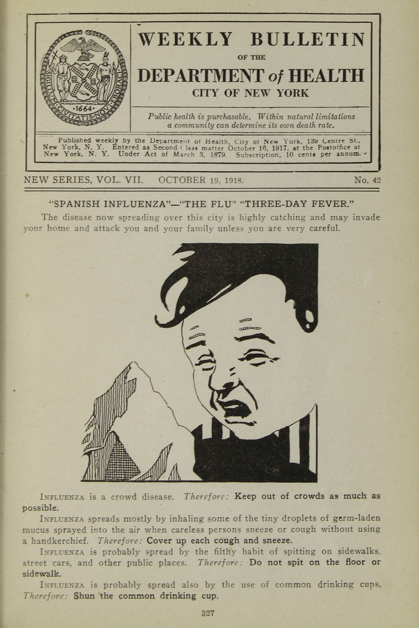 There were daily newspaper reports, by borough, of new cases of flu and pneumonia. By October 5, the Surgeon General was calling for New York City to close its schools, churches and theaters, but Copeland was still insisting that we were not stricken in the same way as Boston; he also said that half of the 1,600 cases that day “were in 600 families.” However, that day the Health Department issued new rules that asked stores, offices, textile manufacturers and “other manufacturers” to stagger their hours so that crowding on the subway could be lessened. Copeland’s solution seemed to be to “keep calm, and go about your business.”