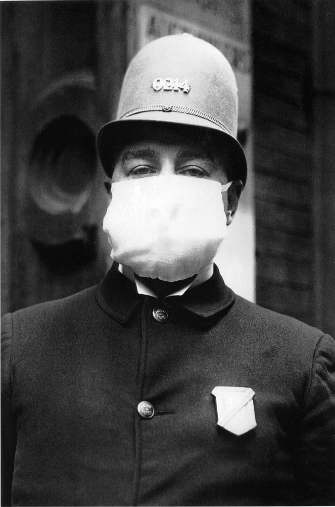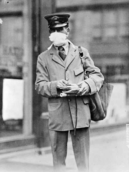 Wearing a gauze mask became common, first by hospital workers, and then by others. The most-often printed photos of the 1918 flu show a New York City postal worker, a sanitation worker, and a police officer wearing masks. This young women workers photo has been shared a lot too.